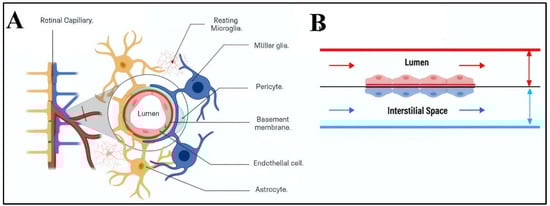 Schematic of key cellular and structural features of the inner blood–retinal barrier (BRB). (A) This neurovascular barrier tissue is primarily composed of endothelial cells and pericytes within retinal capillaries, as well as astrocytes and Muller glia that reside within neural tissue. (B) Side view of circulating blood flow that exerts continuous shear stress upon endothelial cells that line the lumen (top). Also shown is a side view of cognate neuroglia exposed to shear stress from interstitial flow of neural tissue (bottom).