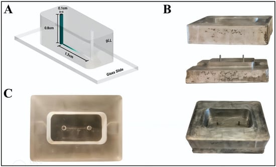For the three-dimensionally printed resin mold, the gLL design mold was also printed using stereolithography (SLA), or vat photopolymerization, where a light source was used to cure liquid resin into hardened plastic. Molds were manufactured using a Formlabs Form 2 Resin Printer for vat photopolymerization of conventional polylactic acid (PLA) resin []. As shown in Figure 3B, 3D modeling files were converted to gcode with the PreForm slicer at 100 μm resolution, printed in clear resin, then washed twice by immersion in isopropyl alcohol.