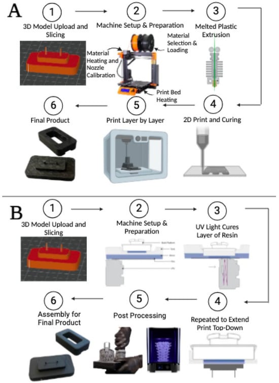 Summary of key steps in the rapid prototyping of 3D molds used for elastomeric soft lithography. (A) Fused deposition modeling (FDM) was used to manufacture plastic molds of polyethylene terephthalate glycol (PETG), wherein the 3D device model was converted to gcode for melted plastic extrusion and printed layer by layer. (B) Stereolithography (SLA) was used to develop resin molds of polylactic acid (PLA) via digital upload of the 3D device model, UV curing of layered resin, and two rounds of post processing in isopropyl alcohol.