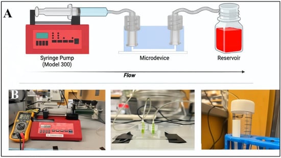Flow was introduced through the source reservoir of the device to initiate flow along the microchannel towards the opposite reservoir. A 60-mL volume of cell media was loaded into the pumping device via syringe, as per Figure 4.