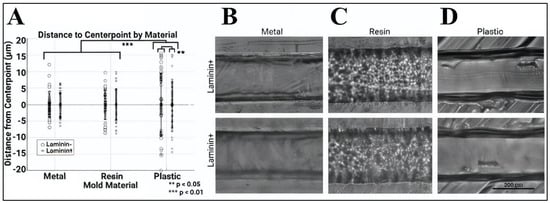 PDMS devices produced via curing upon the 3D-printed molds were next measured for surface roughness of the channel’s inner surfaces. The devices were measured with and without a laminin coating to determine their utility for cell adhesion and survival. Figure 5A illustrates the distance measured from the surface of the channel center point to its respective mean height. As shown, PDMS devices produced from the metal molds exhibited an average surface roughness with a deviation of ±15 μm, while elastomeric channels produced from PLA resin molds and PTEG plastic molds exhibited a surface roughness with a deviation of ±19 μm and ±30 μm from average channel heights, respectively. The values of the surface roughness of elastomeric channels cured using SLA resin were insignificant from those of channels cured upon metal molds (p > 0.05). By contrast, the surface roughness of channels produced using PTEG plastic molds was significantly different from those produced using metal molds (p < 0.05). Moreover, only elastomers produced using plastic molds exhibited significant differences in surface roughness between non-coated and coated laminin surfaces (p < 0.01). As a result, the remainder of this study focused on elastomers produced from resin molds using PLA.