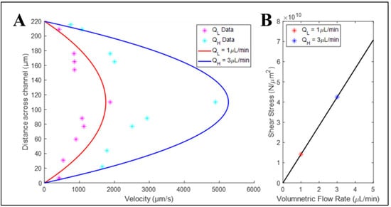 Measurement of particle flow within 3D-printed microsystems alongside analytical flow model. (A) Measured velocity of individual microbeads (*) plotted against one-dimensional analytical solutions to Poiseuille Flow with low (QL) and high (QH) volume flow rates. (B) Analytical solution to imposed shear stress and QL and QH in the same system.
