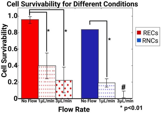 Next, analytically determined values of shear stresses imposed by those flows were tabulated to continue with the flow-based study of both retinal endothelial cells (RECs) and retinal neural cells (RNCs) significant to the BRB. The viability measurements illustrated that RNCs were more strongly affected by shear stress than RECs (Figure 7). While sustained flow decreased the survival of both cell types, few RNCs were able to survive at a sustained flow at QH, leading to only trace amounts of viable cells. This result is in line with in vivo conditions, where cells reside within retinal tissue and are thereby exposed to minute, interstitial flows much lower than the capillary flow rates upon RECs [,]. The results of RECs’ survival were was also of note, as the data showed no difference between the QH and QL flow rates used. This may indicate that the flow rates applied did not approximate in vivo conditions accurately. We note that this is a large limitation of many commercial syringe pumps, which are unable to apply sustained ultra-low flow rates when connected to microchannels via capillary tubing. An interface with a specialized (and more costly) flow apparatus will greatly increase the applicability of this BRB flow study.
