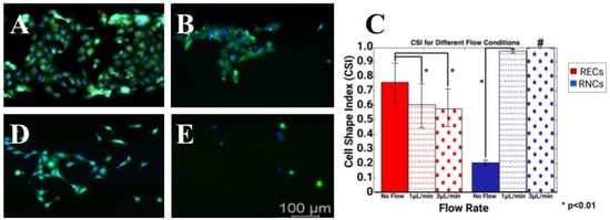 The final set of experiments applied different volume flow rates of QH and QL upon monolayers of RECs and RNCs seeded within PDMS elastomers produced from SLA resin molds. RNCs were observed to be nearly confluent in control conditions (no flow) but began to display larger surface areas devoid of cells with an increasing flow rate. Interestingly, Figure 8A,B show that while the cell survival rate of RECs decreased with an increased flow rate, the cell morphology became more elongated, as reflected by CSI values that approached 0. Furthermore, changes in CSI values were insignificant between low and high flow rate conditions (p > 0.05). By contrast, RNCs were more strongly affected by induced flow. As shown in Figure 8D,E, significant numbers of cells did not survive the low flow rate and only trace amounts of DAPI were recorded to identify viable cells after exposure to high volume flow rates. Moreover, average CSI values of RNCs significantly increased to approach a value of 1 under QL to indicate fully rounded cells typical of apoptosis or detachment.