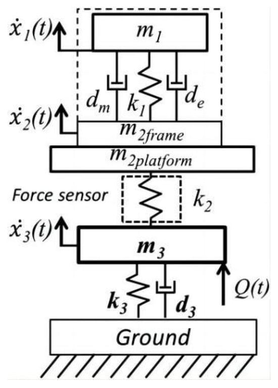 The vibrating structure is a mass-spring-damping system with one degree of freedom (m3, k3, d3) containing the mechanical part of the vibrating energy harvester (m1, k1, dm, de), whose resonance value can be adjusted to the intrinsic value of the vibrating structure. The force transducer is modelled as a mass-spring system (m2platform, k2), which allows for fixing the framework of the power collector to the vibrating frame. The mechanical force information of the vibrating energy harvester is calculated from the value of k2 of the spring in the force sensor and then from Equation (2).