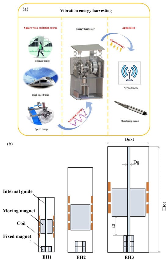 - Wang, Y.; Gao, Y.; Chen, Z.; Zong, R.; Li, Y.; Guo, R.; Azam, A.; Qi, L.; Zhang, Z. Performance analysis of electromagnetic vibration energy harvester under square excitation. Int. J. Mech. Sci. 2024, 271, 109127. [Google Scholar] [CrossRef]
