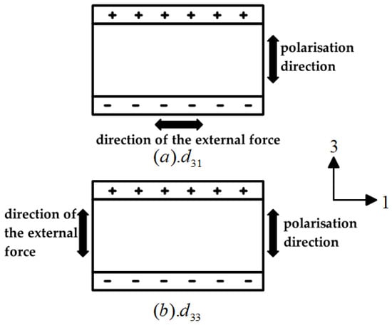 As can be seen from Figure 3, the d31 working mode has a stress direction of 1 and a polarisation direction of 3, which are orthogonal to each other; the d33 working mode has a stress direction of 3 and a polarisation direction of 3, which are parallel to each other. The difference between the above two modes is not only that the stress direction is different from the polarisation direction, but also that the piezoelectric constants of the two modes are quite different. In terms of the voltage and charge outputs in these two modes of operation, when the circuit is open, they can be expressed as follows [24]: