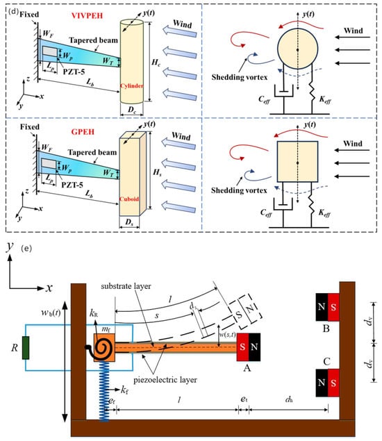 (a) Physical diagram of PSN-PZT piezoelectric ceramic product [28]. (b) Friction vibration test rig [29]. (c) Cantilever beam-spring-pendulum structure [30]. (d) Schematic diagram of conical beam FIVPHEH [31]. (e) Configuration diagram of the TPEH + DM system [32].