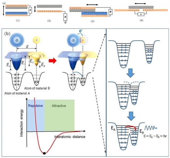 (a) Four modes of friction nanogenerators [39]. (b) Potential well model of electron cloud [40].