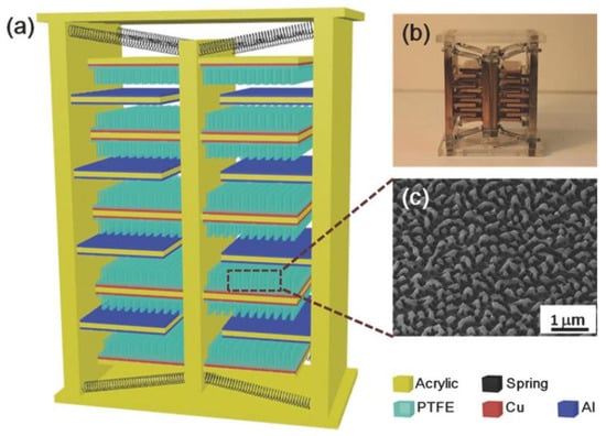 - Yang, W.; Chen, J.; Jing, Q.; Yang, J.; Wen, X.; Su, Y.; Zhu, G.; Bai, P.; Wang, Z.L. 3D Stack Integrated Triboelectric Nanogenerator for Harvesting Vibration Energy. Adv. Funct. Mater. 2014, 24, 4090–4096. [Google Scholar] [CrossRef]