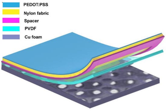 Friction nanogenerators rely on the charge pumping effect of the friction point potential to produce electricity by friction between polyester fibre sheets and polydimethylsiloxane (PDMS) sheets [38]. With the help of detachment technology, when friction occurs, a charge separation and potential difference is created between the two polymer films, which can be used to generate an electric current through an outside circuit. During friction, the polyester fibres produce electrons, while the polydimethylsiloxane receives them. In addition, mechanical deformation from external pressure causes them to frictionally generate electricity [37]. In addition, the vibration energy in the surroundings is also the reason for this mechanical deformation, so using vibration power in the surroundings to provide a source of energy for the friction nanogenerator is one of the main directions of TENG’s research nowadays.