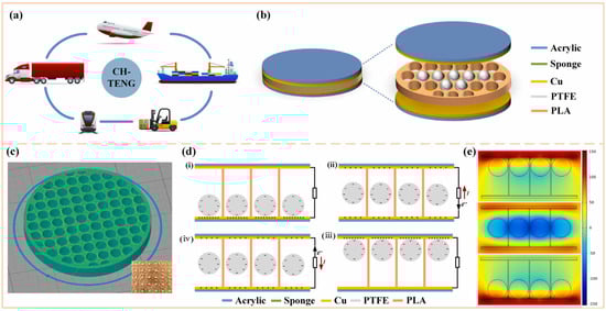 (a) Some advanced application scenarios of vibrational energy collecting. (b) Advances in friction electric vibration energy harvesters. (c) Middle layer architecture. (d) Schematic illustration of the energy producing process. (e) Potential distribution of CH-TENG obtained by FEM simula-tion [43].