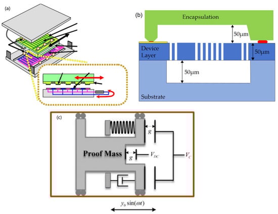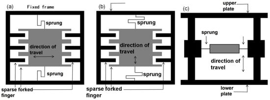 Schematic structure of electrostatic vibration energy harvesting. (a) Area-tuned fork-finger variable capacitance. (b) Distance-tuned fork-finger variable capacitance. (c) Parallel-plate variable capacitance.