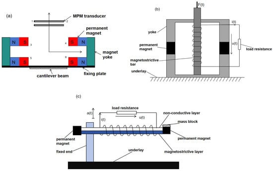 (a) Schematic structure of a magnetostrictive vibration energy harvester [56]. (b) Direct-drive MVEH [57]. (c) Cantilever beam MVEH [57].
