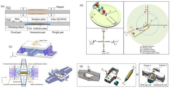 (a) Structural diagram of a magnetostrictive vibrational energy harvester made of iron–gallium alloy [58]. (b) Schematic diagram of the movement of a bistable magnetostrictive vibration collector in a revolving coordinate system [60]. (c) Structural diagram of a magnetostrictive two-dimensional kinetic energy collector [61]. (d) Structural diagram of a two-stage rhombus-shaped magnetostrictive vibrational energy harvester device [63].