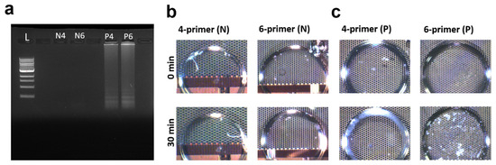 (a) Agarose gel results of the E. coli LAMP assay. L: 1 kb DNA ladder. N4: negative control of 4-primer LAMP. N6: negative control of 6-primer LAMP. P4: positive sample of 4-primer LAMP. P6: positive sample of 6-primer LAMP. Microscope images of E. coli LAMP assay on the biochip at 0 min and 30 min: (b) negative control samples and (c) positive samples.