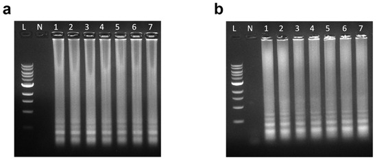 Agarose gel results of the sensitivity test for the LAMP assay. The lanes labeled 1–7 correspond to Sample 1–Sample 7 in Table 1. L: 1 kb DNA Ladder. N: negative control. (a) Four-primer LAMP; (b) six-primer LAMP.