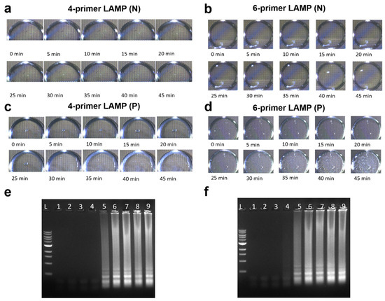 Real-time images of samples on the biochip during the LAMP assay. (a) A negative sample with 4-primer LAMP; (b) a negative sample with 6-primer LAMP; (c) Sample 7 with 4-primer LAMP; and (d) Sample 7 with 6-primer LAMP. (e,f) Agarose gel results for Sample 7 with 4-primer LAMP and 6-primer LAMP. The lanes labeled 1–9 correspond to the time at 0 min, 5 min, 10 min, 15 min, 20 min, 25 min, 30 min, 35 min, and 40 min. L: 1 kb DNA ladder.