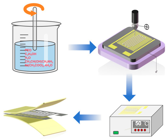 The prepared precursor solution was transferred into a 1 mL plastic syringe, and then the syringe was fixed to the syringe pump with a feeding rate of 1 μL/h. The stainless-steel needle was connected to the positive electrode of the high-voltage power supply, and the receiver plate was connected to the negative electrode. The distance between the nozzle and the receiver plate was 1 mm, and the applied voltage was 1.46 kV. An interdigital electrode served as the negative receiving plate to collect the direct-writing structure, of which the size of the sensitive area was 5 mm × 10 mm. The electrode width was 50 μm, the electrode spacing was 50 μm, and there were 15 pairs of fork fingers on each interdigital electrode. As the polymer solution was pushed out of the nozzle, it tended to form spherical droplets with the action of surface tension. When the high voltage was applied to the surface of the droplets, the electrostatic repulsion was strong enough to cause the droplets to form a conical shape, i.e., a Taylor’s cone. When the electric field strength was sufficiently large, a jet was formed at the tip of the Taylor cone. Subsequently, the jet was stretched and thinned and was ultimately deposited onto the collecting plate as nanofibers. The fiber collected from the negative plate was heated with a heating table at 50 °C for 1 h to obtain a NiO fiber. A Polyimide (PI) film with a thickness of 0.05 mm was used as the encapsulation material, and the PI film was cut into a rectangle at the size of 10 mm × 20 mm. Copper wires were used as conductors to connect to the ends of the fork finger electrodes with nickel oxide film to complete the preparation of a 10 mm × 20 mm flexible temperature sensor with a thickness of 0.11 mm. Since the PI is stable over a wide temperature range of (−269 °C to 400 °C) and has high mechanical strength and flexibility, its excellent water resistance and hydrophobicity help maintain performance and reliability in humid environments. In addition, the assembled temperature sensors are easy to deform without causing a structural collapse, giving the sensing element excellent flexibility. The preparation process of the NiO flexible temperature sensor is shown in Figure 1.