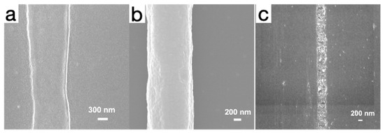 The synthesis process of the material and the morphological characteristics of the final fiber structure is investigated. Scanning electron microscopy (SEM) is used for characterization. Scanning electron microscopy (SEM) is a high-resolution imaging technique that provides microscopic details of the surface morphology of materials. Figure 2a shows the SEM image of the unsintered treated fiber. From the image, it can be seen that the surface of the fiber is rough. Figure 2b shows the SEM images of the fibers after sintering at a temperature of 50 °C. The surface of the fibers after sintering at 50 °C becomes significantly smoother compared to the unsintered fibers, indicating that sintering at a lower temperature helps in the repair of defects on the surface of the fibers and the densification of the structure due to sintering at a lower temperature. This smooth surface morphology contributes to the chemical stability of the fibers. The fiber diameter obtained after sintering at 50 °C was 1.340 μm. Due to the smaller diameter of the fibers, a finer temperature measurement resolution can be provided, enabling accurate monitoring of temperature changes. At the same time, the very fine feature size of fibers prepared by the low-temperature sintering electrohydrodynamic direct-writing technology makes it highly promising for the manufacture of high-precision electronic components. Figure 2c shows the SEM image of the fibers after sintering at a higher temperature of 100 °C. Compared with the fibers sintered at 50 °C, the liquid phase substances such as water and anhydrous ethanol gradually evaporate as the temperature increases, resulting in a discontinuous agglomerate morphology of the fibers. When the temperature exceeds 60 °C (above the melting point of PEO), PEO enters an amorphous state, resulting in the conductive fibers losing their fibrous structure and melting, and the fibers are dispersed at a sintering temperature of 100 °C. By observing the morphology of fibers at different sintering temperatures, it is evident that the sintering temperature significantly affects the fiber structure. This impact is not only reflected in the surface morphology of the fibers but also extends to their physical and chemical properties, thereby significantly influencing the application performance of the material. Completing the sintering process at lower temperatures helps protect heat-sensitive flexible substrates and other materials, an advantage that is particularly crucial for application in flexible electronic devices and plastic materials. Through this low-temperature sintering technology, a sophisticated and adaptable electronic component is expected to be achieved, broadening the scope of material applications.