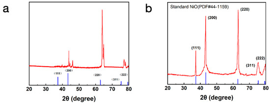 X-ray diffraction (XRD) is an important characterization technique used to analyze the crystal structure and phase composition of materials. Figure 3a demonstrates the XRD spectra of fibers that have not been cryo-sintered, while Figure 3b shows the XRD spectra of fibers that have been cryo-sintered at 50 °C. A comparison of Figure 3a,b shows that nickel oxide (NiO) is produced after low temperature sintering.