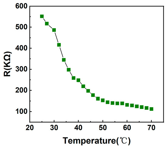 The sensor has a very small change in intrinsic resistance and stable electrical properties in the bending state. In order to analyze the response of the senor to temperature changes, the temperature sensor was fixed to a temperature control platform, and a conductive tape was used to ensure close contact between the sensor and the platform. By varying the applied voltage, it is possible to regulate the temperature on the temperature-controlled platform, resulting in a continuous temperature change from 25 °C to 70 °C. During this process, the resistance value of the sensor exhibits the characteristic of decreasing with increasing temperature, specifically from 552.1 kΩ to 112.1 kΩ. The flexible temperature sensor exhibits typical negative temperature coefficient (NTC) semiconductor characteristics as shown in Figure 4.