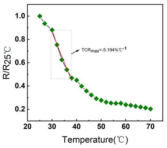 where RT and R0 are the resistance measured through the sensor at the applied and ambient temperatures, respectively, and ΔT is the temperature change. Negative Temperature Coefficient (NTC) sensors exhibit different Temperature Coefficient of Resistance (TCR) at different temperature stages, which is primarily due to the characteristic changes in the resistivity of the material with temperature variations. By fitting the normalized resistance with respect to the room temperature (R/R25 °C), as shown in Figure 5, at the temperature range of 25 °C to 70 °C, the maximum value of the Temperature Coefficient of Resistance (TCR) is −5.194% °C−1 (30–38 °C). From this, it is understood that temperature sensors manufactured using low-temperature sintering electrohydrodynamic direct-writing technology exhibit excellent sensitivity characteristics due to their unique manufacturing process and material selection.