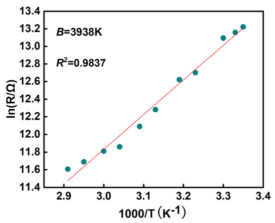 Figure 6 illustrates the relationship between the natural logarithm of the resistance (lnR) of the temperature sensor and the reciprocal of the absolute temperature (1000/T). As shown by the red line in the figure, the fit goodness is close to 0.9837. The results indicate that lnR is linearly related to 1000/T. This linear behavior is important in practical applications because it simplifies the post-measurement processing procedure.