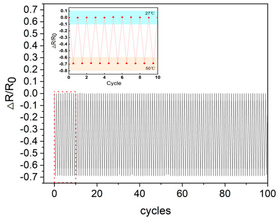 To assess the reliability and stability of the temperature sensor, it was subjected to 100 cycles of heating and cooling to evaluate its endurance under continuous thermal stress. Among these tests, the first 10 cycles were selected, and the temperature changes during these cycles were displayed in detail and magnified to more clearly observe their performance (Figure 7). The sensor showed good stability. This type of testing is critical to assessing the stability and reliability of the sensor under extreme temperature changes. By simulating the environmental conditions likely to be encountered in real-world applications, it is possible to ensure that the sensor maintains its performance over a long period of operation. During testing, the sensor demonstrated an excellent full-time response. It means that regardless of temperature changes, the sensor is able to provide temperature readings without performance degradation or delay. The rapid and consistent responsiveness is critical for systems that require real-time temperature monitoring, such as in industrial automation, environmental monitoring or medical devices.