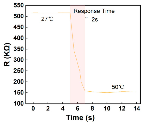 The NiO flexible temperature sensor is able to quickly transfer heat to the sensing element due to its good thermal conductivity, resulting in a fast response to temperature changes. The compact design of the sensor also contributes to reducing the length of the heat transfer path, resulting in a faster response time. As shown in Figure 8, the response time from 27 °C to 50 °C is only 2 s. The fine fibers produced by low-temperature sintering and electrospinning have a faster thermal response time, enabling a rapid detection of temperature changes. This helps to improve the response speed of temperature sensors to temperature fluctuations, which is an advantage over traditional thermometers. The response time of traditional thermometers is affected by a number of factors, including the type, size and material of the temperature sensor, as well as the type of the medium and flow rate. For example, with air-packed mechanical thermometers, the response time for a rise from 10 °C to 90 °C typically takes about 30 s. It shows that the sensor can be used in monitoring human physiological information, industrial process control, automotive engine management systems and medical devices.
