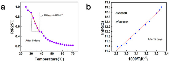 The TCRmax and B values of the sensor remain essentially stable with minimal change after being placed under ambient conditions for five days. As shown in Figure 9a, within the temperature range of 25 °C to 70 °C, the maximum values of TCR are −4.827% °C−1, respectively. As depicted in Figure 9b, the fitted value for B is 3856 K. The test results confirm that the NiO flexible temperature sensor has good chemical stability. Proper encapsulation and the rationality of the device structure ensure the long-term stability of the sensor under the influence of environmental factors. The sensitivity index of the temperature sensor shows good continuity, with no significant changes observed during the environmental test. Devices fabricated by low-temperature sintering electrohydrodynamic direct writing can operate stably under various environmental conditions, including stability in the face of humidity and temperature changes.