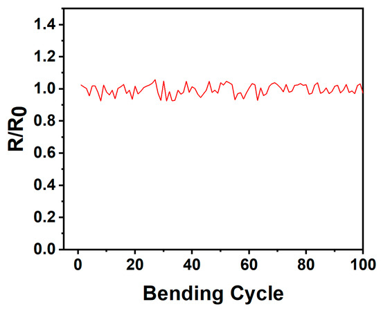 In order to check the mechanical flexibility of the sensor, the NiO temperature sensor is subjected to 100 mechanical performance tests at the same bending angle (45°) and the same temperature (25 °C) as shown in Figure 10. It is clear from the figure that the NiO temperature sensor maintains almost the same resistance under repeated cycles of bending. This indicates that the sensor not only demonstrates excellent stability under mechanical deformation but also possesses outstanding flexibility, enabling it to adapt to the curves and movements of the human body, making it highly suitable for applications in wearable devices and flexible electronic products. The small changes seen in the temperature sensor during the bending test may be the result of experiencing mechanical stresses that result in small changes in the internal structure of the sensor, and these small structural changes may affect the resistive characteristics of the sensor, resulting in small changes in resistance.