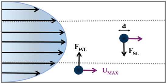 As mentioned before, the presence of walls modifies the flow field around the particle, causing its motion to be retarded in both the parallel and perpendicular directions with respect to the primary flow [10]. A lateral migration of the particle emerges as the consequence of two forces perpendicular to the primary fluid flow: (i) the shear-lift force, and (ii) the wall-lift force (Figure 2).
