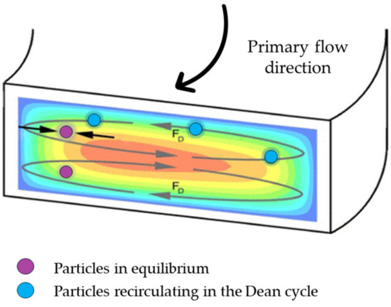 Inertial focusing techniques exploit the action of inertial forces acting on particles suspended in a fluid within a microchannel. These techniques are based on inertial effects that occur between the Stokes flow regime (laminar) and turbulent flow regime [32]. Inertial and viscous forces act on particles in fluid confined within a micrometer channel, causing them to migrate towards specific equilibrium positions. The dimensions and geometry of both channel and particles play a critical role in this effect, resulting in lateral migration in straight channels [31,33] and the generation of Dean secondary flows in curved channels (i.e., serpentine, spiral channels) [34,35,36,37,38]. Additionally, the microchannel cross-sectional shape influences how inertial and viscous forces balance, thereby affecting particle behavior.