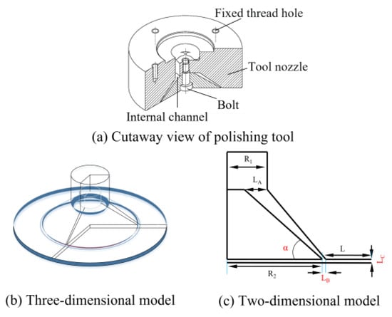 The Venturi structure has a significant influence on cavitation results, and its size determines the proportion of the cavitation area. To obtain a larger cavitation area, it is necessary to simulate the cavitation effect of the polishing tool to obtain an optimal structure. The internal channel of the polishing tool is a three-dimensional rotator, which is simplified to a more intuitive two-dimensional model, as shown in Figure 2. According to the Venturi cavitation principle and the limitations of the actual design, the sizes of some constant parameters were determined, as shown in Table 1.