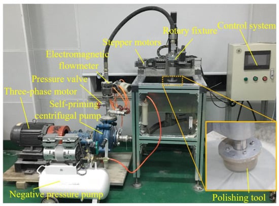 As shown in Figure 4, the polishing system was built to test the effect of cavitation abrasive flow polishing, in which the fluid can be monitored and regulated by the valve, pressure gauge, and flowmeter on the pipeline. The polishing tool is controlled by three stepper motors for self-rotation, horizontal movement, and vertical movement. The processing parameters of cavitation abrasive flow polishing are shown in Table 3.
