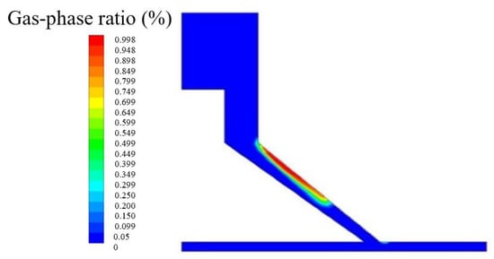 As shown in Table 4, the five levels were discretely distributed in 25 sets of numerical simulation experiments by the orthogonal method. As shown in the range analysis of the orthogonal test in Table 5, the higher the R values, the more significant the influence of the factors. Derived from the range analysis of the orthogonal test, the comparison result for the influencing factors is . According to the cavitation ratio () in Table 4, it can be analyzed that the change in the angle () of the special-shaped Venturi tube leads to apparent changes in the cavitation generation area, and both smaller and larger angles result in very small cavitation areas. When is 25°, is 1.1 mm and is 1.3 mm, Figure 5 shows that the cavitation, which may be affected by the angle () of the Venturi tube size structure design, does not occur in the processing area, but rather directly occurs within the contraction section.