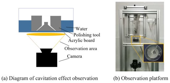 According to the cavitation numerical simulation data from the orthogonal test, when the angle is 55°, the size is 0.9 mm, and the size is 1.4 mm, apparent cavitation phenomena can be generated in the machining area, and the cavitation area can account for ~75.8% of the processing channel area in numerical simulation. However, the cavitation obtained from the numerical simulation of the special-shaped Venturi tube as an auxiliary research means needs to be verified by experiments. Therefore, the cavitation phenomenon is demonstrated by photographs of the observation platform. The sink made of the acrylic board at the bottom is convenient for photographing, as shown in Figure 6.
