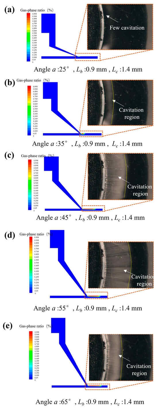 According to the analysis of the numerical simulation, the angle () of the special-shaped Venturi tube is the key factor affecting the cavitation ratio. Thus, the polishing tools with different angles for were manufactured, and corresponding cavitation observations and shootings were conducted to verify the accuracy of the numerical simulation. As shown in Figure 7, the numerical simulation images of the cavitation in special-shaped Venturi tubes with different angles were compared with the actual shootings.