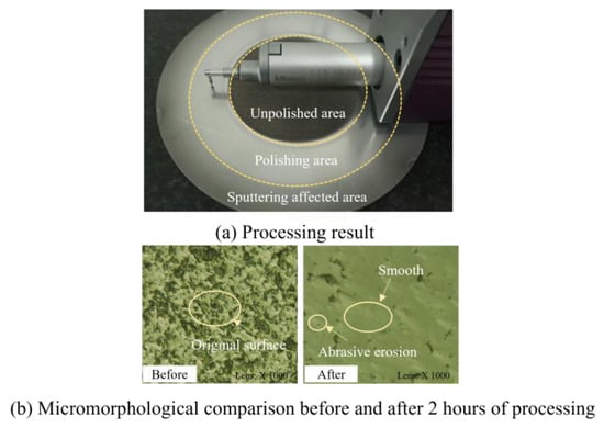 An ultra-depth-of-field microscope, the VHX-600 of KEYENCE Corporation (Osaka, Japan), was used to observe the surface topography of the polishing area, as shown in Figure 8b. The silicon wafer’s original surface had many pits and bumps. After the initial 2 h experiment, the surface topography of the workpiece was changed significantly, the original micro-bumps having been removed and being relatively smooth. The surface showed the characteristic erosion phenomenon of abrasive flow polishing, causing many microscopic pits, which reflected the plastic removal formed by the impact of abrasive particles. In addition, no large areas of ripple-like surface quality resulting from cavitation damage were observed after processing.