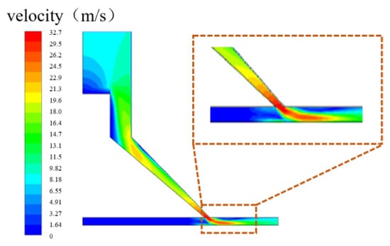 Combined with the numerical simulation of the special-shaped Venturi tube in Figure 7, it was found that the cavitation generation region is mainly concentrated above the flow channel and does not occur near the workpiece, indicating that the cavitation does not directly act on the workpiece surface. The removal of materials is caused by the impact of abrasive particles driven by high-speed water flow. Therefore, velocity flow field analysis was performed on the special-shaped Venturi tube with a larger cavitation ratio, as shown in Figure 7d. The result of the velocity flow field analysis is shown in Figure 9.