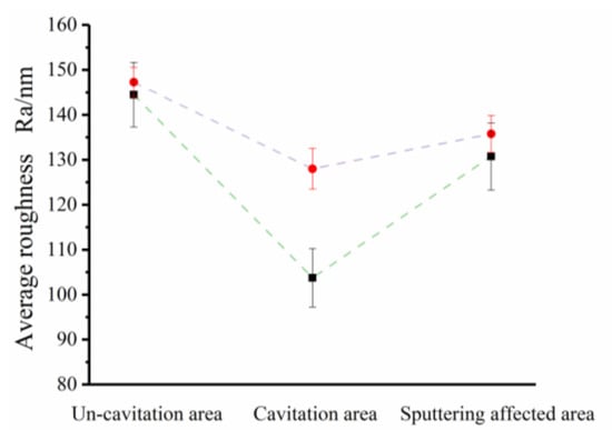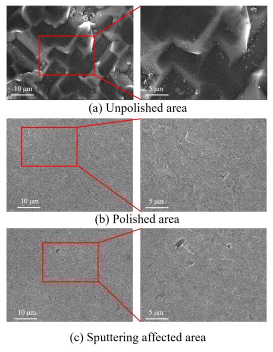 Figure 16 shows the SEM morphology of the wafer surface after processing. The figure shows that, whether it is the polished or sputtering-affected area, the original workpiece surface cracks or micro-peaks are removed and the processed surface becomes smoother. Compared with the morphology in the sputtering-affected area, the morphology in the polished area is similar, which can further indicate that the final processing quality is not affected by a limited amount of cavitation erosion. The translational and rotational movement of the workpiece enables the cavitation to cover the entire surface of the workpiece, which can achieve the highly efficient polishing of the whole workpiece.