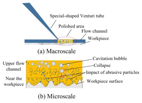 (a,b) Schematic diagram of material removal mechanism of cavitation-assisted polishing in special-shaped Venturi tube.