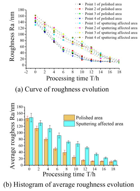 Figure 12 presents a diagram depicting the measurement points. Figure 13a,b display the respective curves and histograms illustrating the evolution of roughness and the average roughness in both the polished and sputtering-affected areas. Regardless of the processing area or the sputtering-affected area, it can be seen that the roughness decreases more significantly at the early stage of processing. Due to the numerous micro-peaks on the silicon wafer surface, the high probability of abrasive impact leads to the high efficiency of both the material removal and the roughness reduction, and the gradual smoothing of the micro-peaks in the later stages of processing leads to the lower material removal and roughness reduction rates. The roughness of the polished area was reduced below 20 nm Ra after 10 h of processing, while the roughness of the sputtering-affected area was ~60 nm Ra, a prolonged processing time still being required to reach the same roughness index.