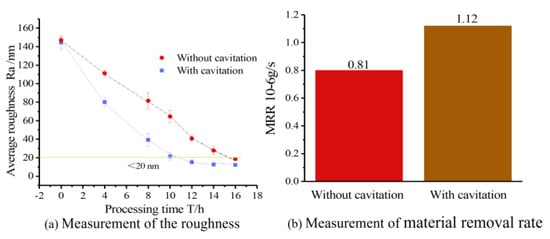 Figure 14 shows the measurement of roughness and the material removal rate in the polished area with and without cavitation processing. It is evident from the roughness curves that cavitation-assisted polishing can improve surface roughness faster. The processing experiments with the same abrasive size (4000#) show that to reduce the roughness to below 20 nm Ra, the processing time of non-cavitation abrasive flow polishing is about 16 h, while the processing time of cavitation-assisted polishing is about 10 h. It was verified that the cavitation effect generated using the special-shaped Venturi design could accelerate the abrasive flow polishing and achieve the same surface quality with ~60% higher efficiency than traditional abrasive flow polishing. Figure 14b illustrates that the traditional abrasive flow polishing method without cavitation, utilizing SiC abrasives, achieves an MRR of 0.81 × 10−6 g/s. In contrast, the cavitation-assisted abrasive flow polishing method demonstrates a significantly higher rate of 1.12 × 10−6 g/s. This indicates that the cavitation abrasive flow polishing method outperforms the traditional method by 38.7% in terms of material removal efficiency.