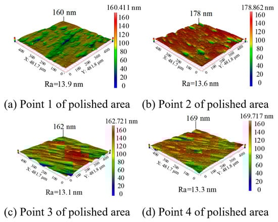 Figure 15 shows the 3D morphology of four specific points in the polished area measured using Super View W1. It can be seen that the profile height of the four points is maintained in the range of 160 nm–178 nm, and the roughness is maintained in the field of 13 nm–14 nm Ra, indicating that a better uniform surface can be obtained by the erosion process using the cavitation-assisted polishing method. From the 3D morphology after processing, it can be seen that there are still impact micro-pits on the surface of the silicon wafer, which is related to the impact of the sharp SiC abrasive particles. The surface quality could potentially be enhanced by employing spherical silicon dioxide abrasives, which lack sharp angles, thereby minimizing surface damage. In subsequent studies, we plan to conduct processing experiments utilizing the cavitation-assisted polishing method with various abrasive particles. These experiments aim to explore and analyze the effects on the material removal rate and surface quality.
