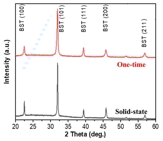 XRD results of the BST material for one-time sintering method and solid-state reaction method.