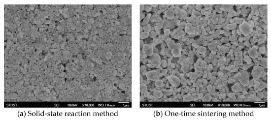 A smaller peak FWHM indicates better crystallinity. FWHM(101) was 0.385 and 0.245 for the solid-state reaction method and the one-time sintering method, respectively. FWHM(111) was 0.324 and 0.235 for the solid-state reaction method and the one-time sintering method, respectively. After calculation, the crystallinity was found to be 96.123% for the solid-state reaction method and 97.223% for the one-time sintering method. Comparing the two, the crystallinity of the one-time sintering method is better. The grain size was then calculated by the Debye–Scherrer formula, as shown in Equation (1), where D is the nanoparticles’ crystalline size, K represents the Scherrer constant (0.98), λ denotes the wavelength (1.54), and β denotes the full width at half maximum (FWHM). In addition, the error of the measured parameters was about 3–5%.