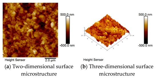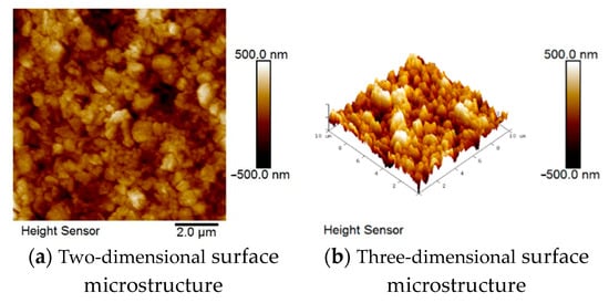 In Figure 4 and Figure 5, the dark-brown color indicates the low points in the sample; the lighter the color, the higher the point. It can be clearly seen that the color distribution in Figure 4a is more uniform than that in Figure 5a, confirming that the solid-state reaction method results in lower roughness as shown by the measured values. The 3D surface microstructures in Figure 4b and Figure 5b clearly show the grain growth and deposition on the surface of the specimen.