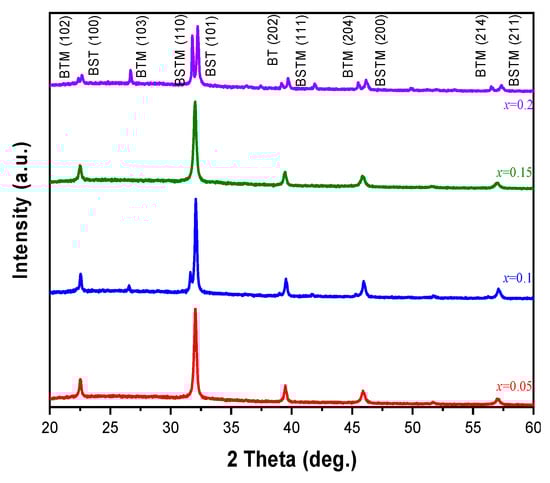 Figure 6 shows the XRD patterns of films formed by coating the substrate with precursor solutions prepared from BSTM powders in different proportions by the one-time sintering method, and it shows that the crystalline phases of the BSTM films were (110), (111), (200), and (211), and the crystalline phases of the BST were (100) and (101). The full width at half maximum (FWHM) of the two stronger peaks 110 and 111 for BSTM films prepared at different proportions was calculated to determine the theoretical densities and crystallinity, as shown in Table 3.